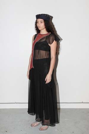- 100% Washed Silk - Contrast paneling with contrast piping - Asymmetrical sleeve detail - Invisible zipper closure at shoulder - Dropped asymmetrical hem with gathered skirt Size & Fit - Model is 5'6" and wears size small - Oversized fit