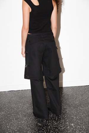 - Made in Los Angeles - 100% Cotton Twill - Fly zipper with button closure - Double layered detail - short layered over pant that attaches at the waistband - Tonal bow detailing down sides of short - Relaxed fit Size & Fit - Model is 5'6" and wears size XS - Relaxed fit - Fits true to size