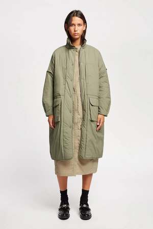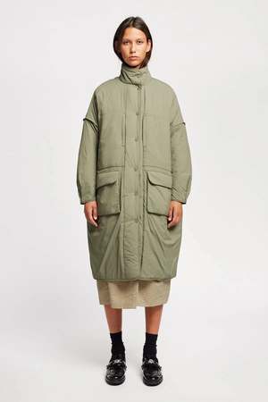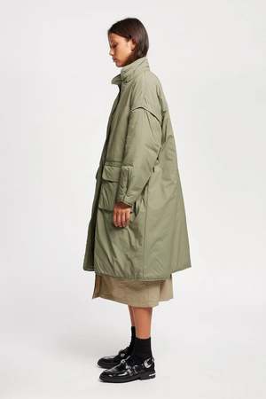 An oversized silhouette featuring a concealed zip and stud button closure. The Restore Coat is designed with a high collar, dropped shoulders with pleat detailing, generous front patch pockets with flap and side-entry zip closures, and additional zip pockets at the chest. A stud-button cuff allows you to cinch in the sleeve. Thoughtful proportions create a modern shape while maintaining sophistication. Materials: 100% Recycled Nylon, 100% Post Consumer Poly Fill Fit: Oversized silhouette