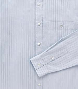 The Jones Cotton & Silk Shirt in Blue Stripe from Knickerbocker, NYC. The Jones Shirt is a relaxed-fit button-down with a clean finish and single chest pocket. This version is made from a breathable cotton and silk blend that offers a soft hand and clean drape. Lightweight and easy to wear, it is well-suited for warmer weather and refined enough to dress up or down. - 82% cotton, 18% fine silk, woven in Portugal - Shell buttons - Made in Portugal