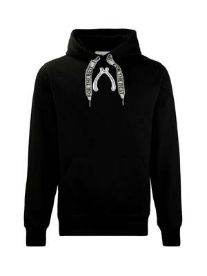 The Double Wishbone Hoodie in black by Kolme Lespere is a heavyweight organic cotton hoodie with a varsity-style patch. It includes a kangaroo pocket, flat drawstring hood, and ribbed cuffs and hem. Made in Portugal.