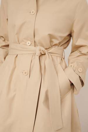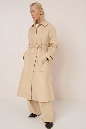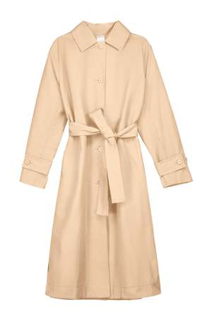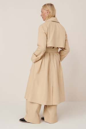 Inspired by utilitarian design, the Cleo Trench Coat features traditional details such as a storm flap, a single back vent, inner breast pocket, and adjustable sleeve tabs. Fitted through the shoulder and relaxed through the body, it comes with a detachable belt for versatile styling. Crafted from durable light organic cotton canvas in the Dune colourway and partially lined in double pinstripe cotton. All Fairtrade organic cotton. All plastic-free.