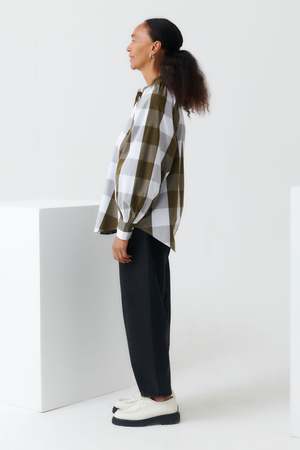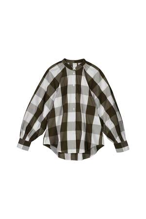 A long sleeve shirt featuring a stand collar and a curved hemline. It has a full, raglan cut sleeve and is finished with gathered detailing at the neckline and cuff.