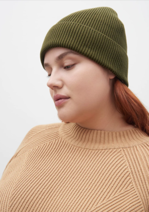 A rib-knitted beanie with a rolled hem. Made from 100% certified Fairtrade organic cotton, it has been individually knitted to prevent yarn waste during production.
