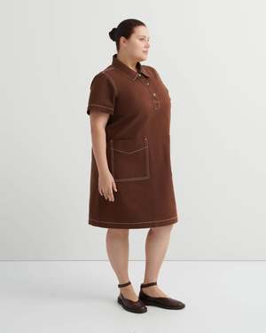 A playful A-line dress crafted from heavyweight organic cotton denim, offering natural structure and a standard fit through the shoulders. Bust darts provide gentle shaping and the dress falls to knee length. Oversized front patch pockets and contrast white topstitching add utilitarian-inspired detail, finished with nickel-free snap fastenings at the half placket. - Crafted from heavyweight 12.8oz organic cotton denim - Standard fit through the shoulders with A-line silhouette - Knee length - Oversized front patch pockets - Contrast topstitching - Nickel-free snap fastenings Fabric Plastic free / 100% Fair Trade Organic Cotton. Organic, Fairtrade certified cotton forms the base of our garments along with a considered collectsion of trims and buttons chosen for their natural and recyclable nature, making Kowtow garments completely plastic-free. Our organic cotton is grown using non-genetically modified seeds, without harmful chemicals. Care Spot clean where possible or cold machine wash inside out. Refresh between wears by airing, ironing, or steaming on the reverse.