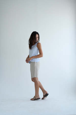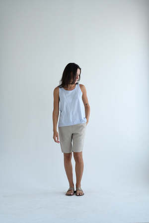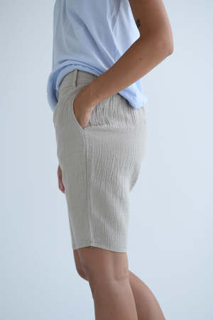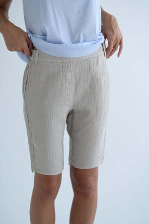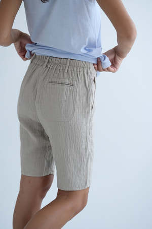 Classic fit shorts from Kristensen du Nord. Elastic waist band, side seam pockets. Single back pocket. 79% cotton, 21% linen. Adeline is 5'7" wearing size 0.