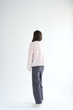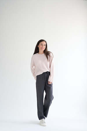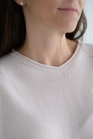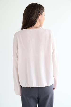 Kristensen du Nord slight vneck cashmere sweater in the palest of pinks. Oversize fit. Ribbed neckline and hem. Stitch detail on sleeve. 100% cashmere. Made in Italy. Emma is wearing size 0.