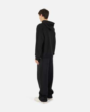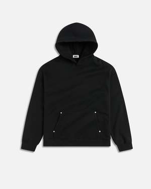 A relaxed pullover hoodie crafted from soft terry fabric. Designed with dropped shoulders and a regular fit, it features a classic kangaroo pocket accented with matte silver rivets, ribbed cuffs and hem, and an easy, everyday feel that balances comfort with subtle detail. Materials 60% Cotton 40% Polyester Care Machine wash cold, gentle cycle, with like colors. Do not bleach. Tumble dry low heat. Do not iron. Do not dry clean. Size & Fit Model is 62 with a 31 waist, wearing a size medium.