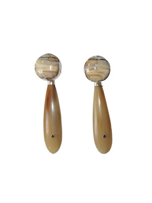 KVK Jewelry Extremely rare and unique, these fossilized Woolly Mammoth tooth root earrings are like wearing an ancient artifact. The natural beige/sand/icy blue coloration is the result of the absorption of minerals from over 20,000+ years. Visually reflecting a literal slice of the earth. Beige buffalo horn drops accented with bezel set black diamonds on one side and luminescent white beige coloring on the other side. Set in sterling silver, the drops are detachable and reversible - a clever and functional design element allowing the wearer the choice to wear the Woolly Mammoth studs with or without the drops. *15mm diameter sterling silver ear studs *2 inch length Buffalo Horn *Lightweight *All materials used by KVK are natural, and sourced by sound, conscious minded gem wholesalers Sorry we can not sell or ship this item to NY or NJ.