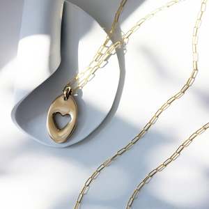 Sculpted in wax and cast, this sweet keepsake pendant sits on a delicate paperclip chain and is perfect for everyday wear. - Yellow bronze pendant with 14K gold filled chain - Chain length: 16.5" - Pendant measures approximately H: 1 1/8" (including bail) x W: 0.5" - Handmade in Portland, OR - FINAL SALE - Type: Necklaces