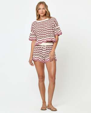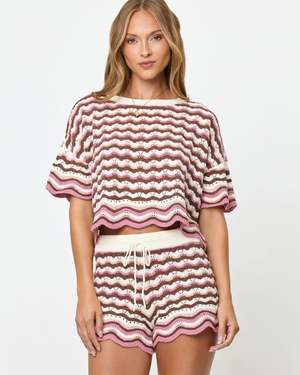 The Sunchaser Short from L*Space is an effortless pick that looks perfect paired with a bikini top or the matching crop top. The high waist, colorful crochet knit, scalloped hem, and drawstring waist make these an easy warm-weather staple. - Scalloped hem - Drawcord through waist - 100% Cotton - Style # SUNSH25 - Type: Shorts