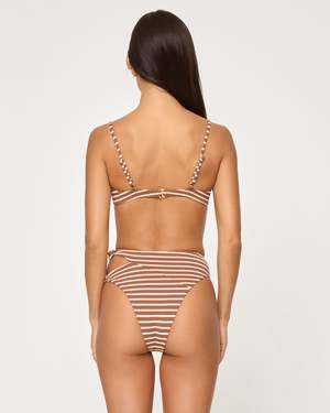 The Jack Bikini Bottom in Brown Sugar features a high waist with a knotted cut-out at the hip and bitsy coverage. Made from a brown-and-cream textured print called Brown Sugar Stripe. - High waist - Cutout at hip - Knot at hip - Bitsy coverage - 80% Nylon, 15% Polyester, 5% Spandex Model Measurements: - Jocelyn, size S - Height 59, Bust 32", Waist 24", Hips 34"