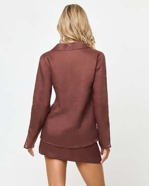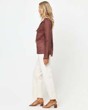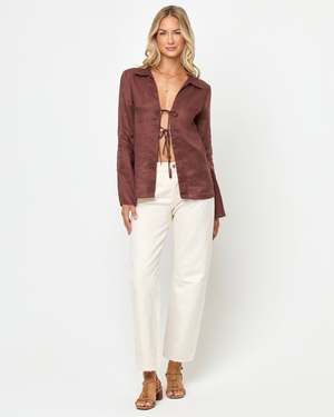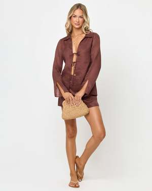 Level up your wardrobe with the Venice Shirt. This tailored tunic-style shirt blends a laid-back linen look with slightly structured details. A collar, slits at the cuffs, and a front tie let you bare some skin or layer it over a cami. Pair it with your go-to jeans or wear it with the matching mini skort. - Tunic-style shirt - Long sleeves - Slits at cuffs - Front tie - Unlined - 100% cotton - Style # APTP0081