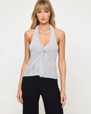 The Callie Halter Tank by L*Space features a halter neckline, V neckline, knot front, open stomach, and ribbed material. Made from 65% viscose, 20% poly, and 15% metallic. Style # CALTP25.