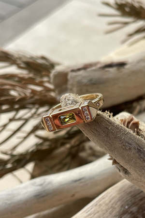 Ring inspired by the Indian Taviz featuring a three-sided motif set with canary yellow, pale pink, and soft green cubic zirconia. Small white cubic zirconias complete the look. 3-micron French gold plating.