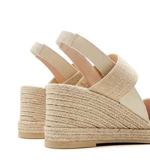 Espadrille wedge sandal featuring a pebble leather front strap, elastic mid-strap, and braided rope platform sole with a rubber traction bottom. Material: Pebble leather Lining: Leather Origin: Spain Heel height: 76.2 mm / 3"