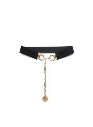 A striking statement belt from La DoubleJ in solid black with a gleaming golden brass medallion. Crafted in smooth, structured black fabric with a bold, sculptural golden brass medallion at the center. Adjustable wrap style allows for versatile styling at the waist or hips. One size with adjustable tie closure. Brass medallion with fabric belt. Made in Italy.