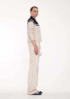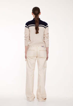 Lightweight long-sleeved lambswool cardigan in ecru with red sailor detail at the shoulders. Blue cotton gingham center-front facings. Ribbings at neck, cuffs, and hem. Raglan sleeves. 100% lambswool. Made in Scotland. Dry clean or gentle hand wash, lay flat to dry. Size S: Bust: 36" Hem: 30" Length from front shoulder to hem: 21" Size M: Bust: 38" Hem: 32" Length from front shoulder to hem: 21.5" Size L: Bust: 40" Hem: 34" Length from front shoulder to hem: 22" Also available in Ecru/Red.