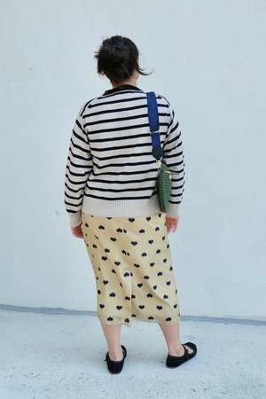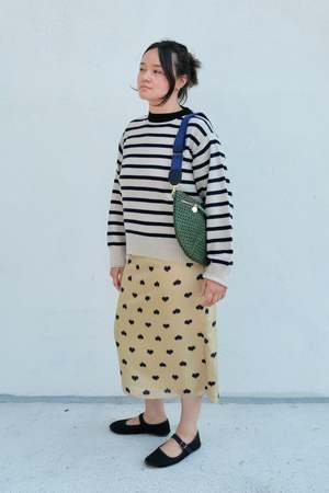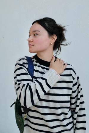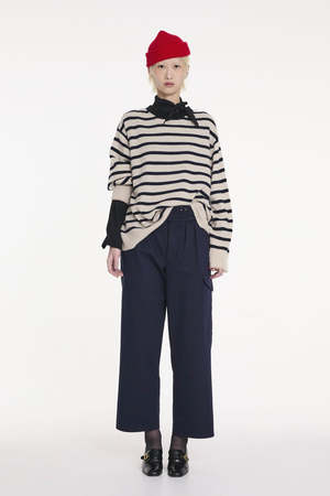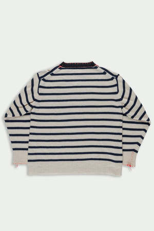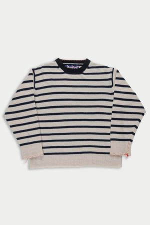Unisex striped pullover sweater with hand-embroidered red stitching and LA FETICHE patched logo2. Designed with a classic ribbed crewneck and ribbed details at the hem and sleeves. Details: - 100% Scottish cashmere sourced from end of line Todd & Duncan stock - Hand wash cold or dry clean - Made in Scotland Alice is 5'2", bust 37", waist 31", hips 38", wearing a size S Styled with the Baldera Skirt, Mary Janes, and Grande Fanny