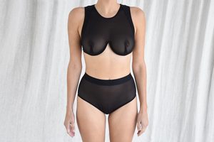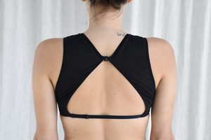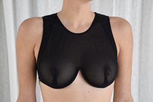 Black bra with la fille d'O's signature monowire design, as well as a top portion that resembles an athletic tank. Nearly opaque black back wraps around and meets sheer black mesh at front. Features unique racerback design. Use this striking piece as a statement under a sheer top or peeking out above the neckline of a dress. 83% Polyamide, 17% Elastane Made in Belgium