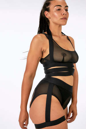 An open suspender with many possibilities. Elastic bands hug the thighs and waist, with slightly sheer panels. Open front and back. OEKO-TEX certified. Made in Belgium.