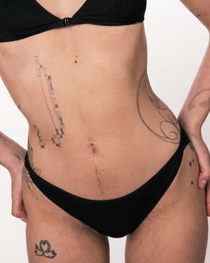 A swimwear version of the best-seller La Fille d'O panty is a low-rise bikini bottom that features angular details on the hips. - Matching bikini tops available. - Made in Belgium.
