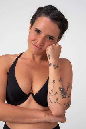 La Fille D'o: Mono Wire Bikini Top - Black - 80% polyamide, 20% elastane - multiway shoulder straps can be altered from a crossed position to halter neck to straight straps in a simple gesture - contour straps adjustable with our easy sizing system - Made in Belgium / Germany/France