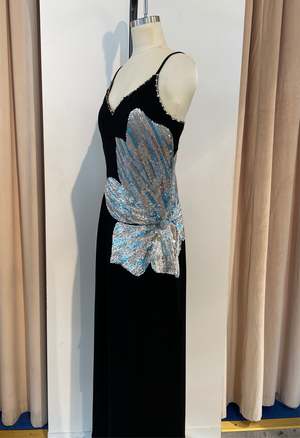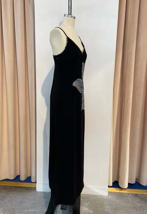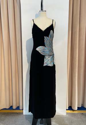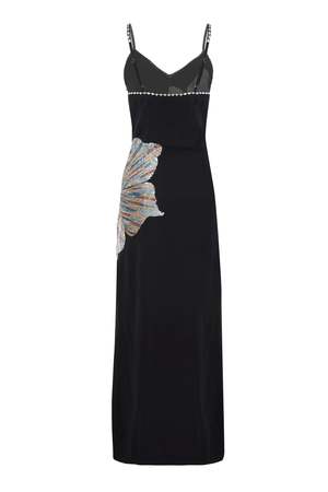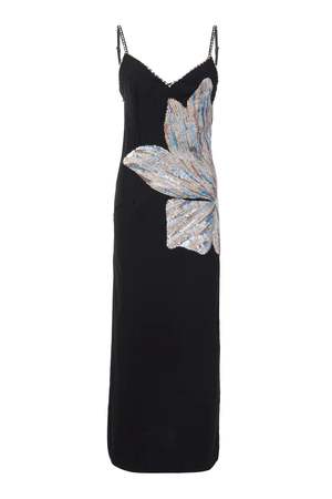 Sleeveless maxi dress featuring a side floral embellishment and embellished trim detail. Crafted from 100% vegetarian silk. Hand embroidered. Care instructions: cold wash and steam iron.