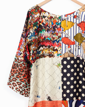 Patchwork minidress in contrasting silks. Easy silhouette with bracelet-length bell sleeves. Slips on. Unlined. Hits above knee. Color: Multi Composition: 100% silk twill Imported