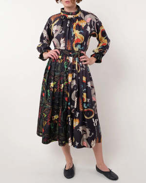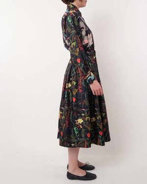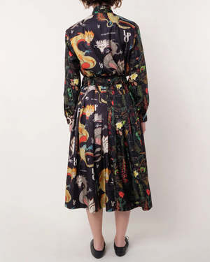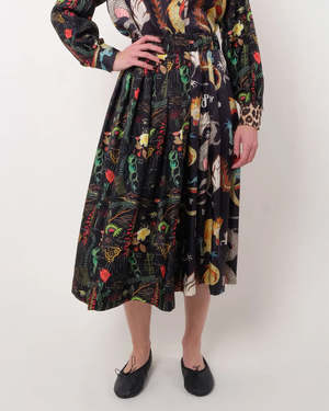 The Venise Skirt by La Prestic Ouiston is a mid-length, pleated skirt crafted from two panels of contrasting patterns.