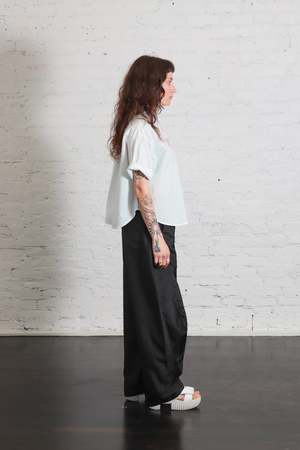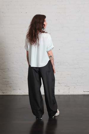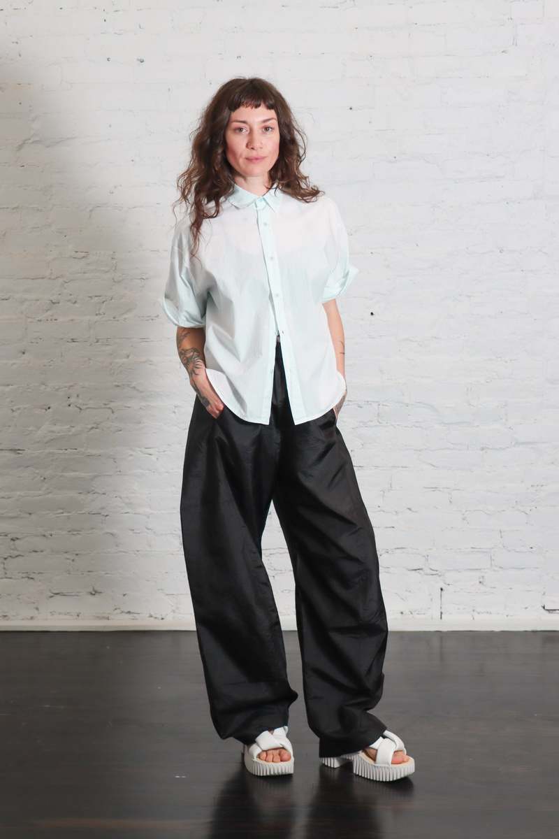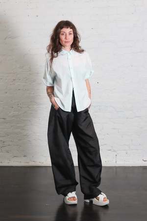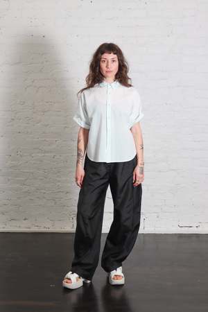 The Camicia Egadi Top by Labo.Art is a modern take on a classic style. This slightly oversized short-sleeve shirt is cut from lightweight cotton poplin and features wide sleeves, a polo collar, and a button placket. Design details include a boxy silhouette, dropped shoulders, and a slightly curved hem. Color: Acqua Fabric: 100% cotton Made in Italy. Fit: Oversized fit, take your normal size. Care: Please refer to care label for full details.