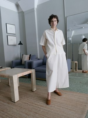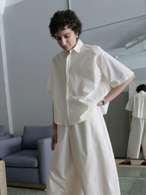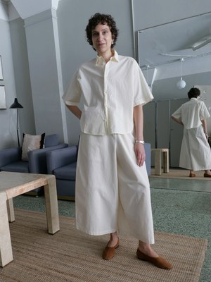 The Camicia Egadi Shirt by Labo.Art is a slightly relaxed short-sleeve shirt cut from lightweight cotton poplin. It features a polo collar, exposed button placket, and wide-cut sleeves for an easy, airy proportion. Soft gathering into the back yoke adds movement and subtle texture, while a curved hem completes the clean silhouette. Made in Italy. (100% cotton) Patricia is 5'7" with a 32 inch bust, 27 inch waist, and 36 inch hip, and is wearing the size zero.