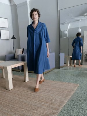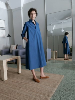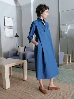 The Abito Scampo In Itaca dress by Labo.Art is a midi-length style cut in a soft A-line silhouette for subtle flare. It features a notched band collar, pop-over placket, and slight 3/4-length sleeves, and is finished with side seam pockets. Made in Italy. 100% cotton. Patricia is 5'7" with a 32 inch bust, 27 inch waist, and 36 inch hip, and is wearing size 0 (equivalent to XXS in Labo.Art sizing).