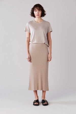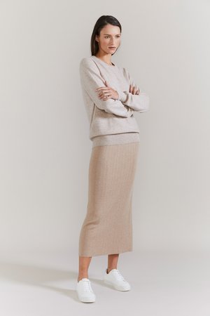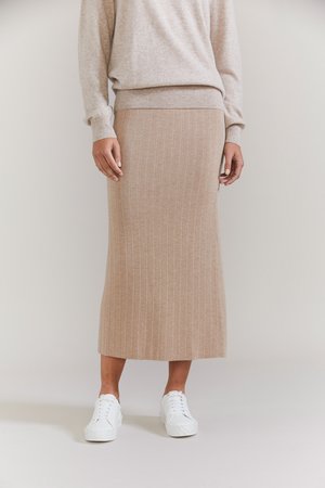 This ribbed knit pencil skirt will become your new go-to for effortless style. Knitted from a viscose / cashmere blend with added nylon to ensure it keeps its shape year after year. It sits neatly around your waist on a soft elastic waistband. Wear with boots and a jacket or sandals and a tee. This style will fit easily into your wardrobe. - Viscose / cashmere/nylon blend - Wide rib - Elasticated waist - Model wears size S / M - Cold hand wash, dry flat and re-shape. Do not wring or tumble dry Size Tips: Fits true to size and due to its ribbed knit is fairly universal in fit