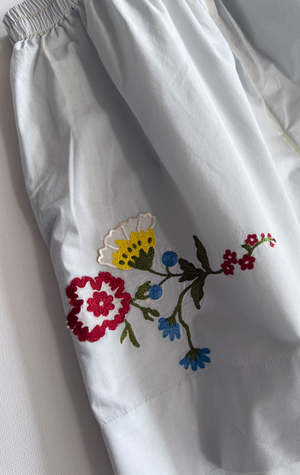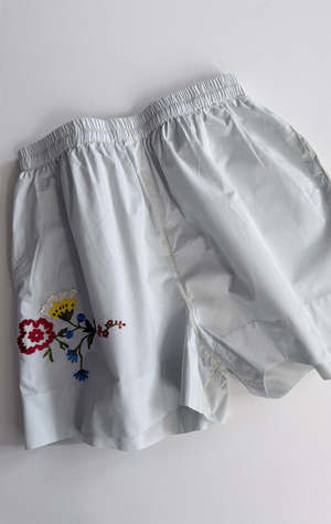 A great summer short to pair with its collared shirt. These pieces were discovered in Paris and are perfect for a summer vibe. Available in three sizes: S, M, L. Made from cotton shirting with colorful stitching finishes, providing a cool feel during summer. Looks great with a cotton t-shirt or its matching floral shirt.