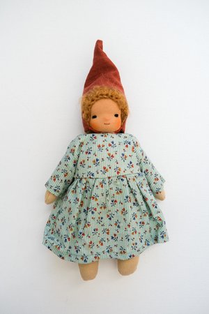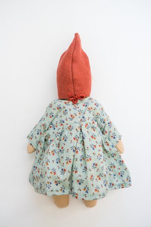 Dolls are handmade with natural materials by Johana, owner of Lambs Ears and Roots, in her home studio in Chile. Each doll is unique and one of a kind, true heirloom quality Bodies are made from cotton and linen filled with natural clean wool. Hair is hand knitted from mohair and their faces are blushed with beeswax crayon (will fade over time). If you have bee wax crayon in home you can easily re-apply. Hats are removable, clothing is not (just closed in the back with a couple of stitches) Gnome hat is made of linen and ties on Measures 10" including hat **** These dolls are not intended for kids under 3 years. Never leave children alone with a toy. These dolls are not for rough play. These dolls can be gently hand washed with a soft soap in warm water. Never put in the machine. Wash them without putting pressure as it could be felted.