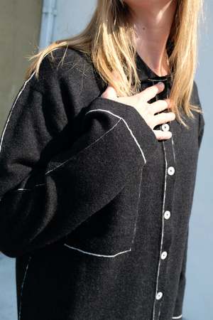 A cozy knitted button up with a soft structured silhouette. Designed with a front chest pocket, a roll hem, and contrast stitching. Details: - 63% Merino Wool / 27% Baby Alpaca / 10% Lycra - Buttons made from recycled paper - Dry clean or wash cold with mild soap - Made in Peru. Liza is 5'9", bust 35", waist 30", hips 39", wearing a size 1.