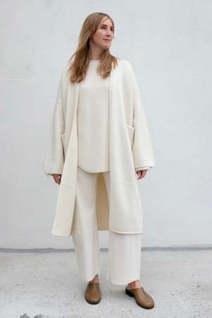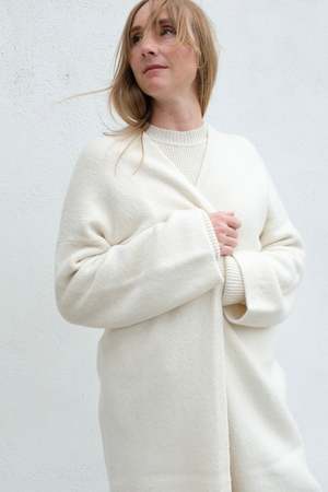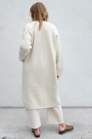 Exude elegance in this long open front cardigan, handloomed in Peru from a luxuriously soft blend of baby alpaca and merino wool. Features signature integral pockets and a rolled hem that hits below the knee. Details: - 50% Baby Alpaca, 50% Merino Wool - ONE SIZE - Dry clean or handwash cold - Made in Peru Liza is 5'9", 35" bust, 30" waist, 39" hips, wearing O/S Styled with Lauren Manoogian Waffle Crewneck and B Sides Slim Lasso / Clair About the brand: Lauren Manoogian is a Brooklyn-based designer whose initial knitwear and accessory work has continually matured as a collectsion of intentional ready-to-wear and evolving lifestyle pieces. With persistent and intuitive shape development, a commitment to a maintained visible hand, and cohesive textural narratives, the brand's subtle essentialism has earned a loyal following since its 2008 inception. Natural material choices along with a dedication to sustainable and sincere handcrafted production practices inform each collectsion's composition and highlight the designer's personal and deep knowledge of textile development from her time in the industry and Rhode Island School of Design studies.