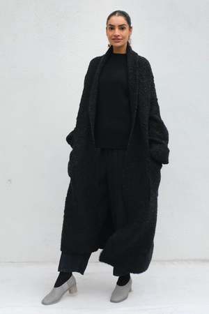 An oversize, open front coat with a soft washed hand and a chunky, irregular texture. This piece features oversize patch pockets, a shawl collar, and a hem that hits at mid-calf. Details: - 60% Baby Alpaca, 26% Merino Wool, 12% Polyamide, 2% Lycra - Hand wash cold with mild soap and lay flat to dry or dry clean - Made in Peru Preet is wearing O / S Styled with Rachel Comey Lex Pant in Brown and Lauren Manoogian Dowel Heel About the brand: Lauren Manoogian is a Brooklyn-based designer whose initial knitwear and accessory work has continually matured as a collectsion of intentional ready-to-wear and evolving lifestyle pieces. With persistent and intuitive shape development, a commitment to a maintained visible hand, and cohesive textural narratives, the brand's subtle essentialism has earned a loyal following since its 2008 inception. Natural material choices along with a dedication to sustainable and sincere handcrafted production practices inform each collectsion's composition and highlight the designer's personal and deep knowledge of textile development from her time in the industry and Rhode Island School of Design studies.