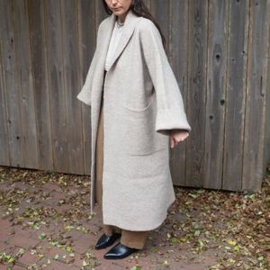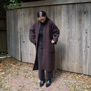 A softly felted, double-face knit designed with an elegant shawl collar and oversized patch pockets. Crafted in Peru.