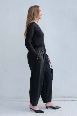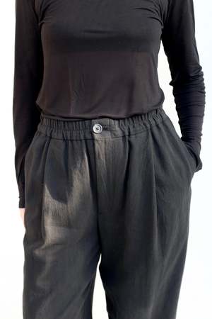 Indulge in the ultimate combination of luxury and comfort. Made from a textural cotton linen blend with a dry slubbed handfeel, these pants have incredible drape and a relaxed structure. The elastic waist ensures an easy, comfortable fit. Details: - 55% linen, 45% cotton - Side inseam pockets - Handwash cold, lay flat to dry, or dry clean - Made in Japan Erin is 6', usually wears size 8/10, and is wearing size 3.