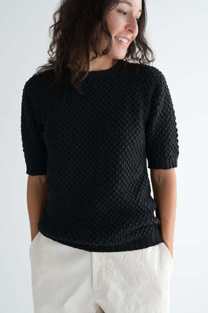 Short sleeve crewneck. Ribbed neckline, hem and sleeves. 95% cotton, 5% lycra. Adeline is 5'7" wearing size 1. Worn with the Lauren Manoogian Structure pants and the Warp pants.