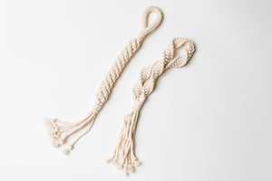 These handmade rope toys combine style and function, allowing for interactive play with your dog while complementing your home decor. Made from natural, dye-free cotton rope, each toy is hand-knotted into two unique macrame designs suitable for tugging, pulling, tossing, fetching, or chewing.