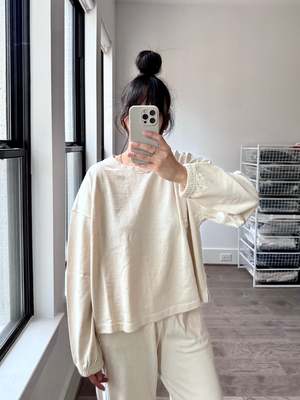 The Naturelle Tee is a dropped shoulder dolman tee with a relaxed fit. Le Bon Shoppe designed this long sleeve tee with a feminine touch, featuring a 100% heavyweight cotton fabric that is raw-textured yet soft and airy. The elastic ruched sleeve opening creates a slight balloon sleeve effect when worn down and scrunches up beautifully. - Dark slate color - Loose fit - 100% Cotton Heavy Weight Low Gauge - True to size - Measurements - XS/S (Chest 24.5", Length 22") - M/L (Chest 26", Length 22.5") - Machine wash cold, hang dry for best result - Model is 5'6" wearing Size XS/S - Christina is 55 wearing Size M/L - SKU #LBC6156 Please note, measurements are provided to serve as a guide. Slight deviations may occur due to the handmade nature of the garments.