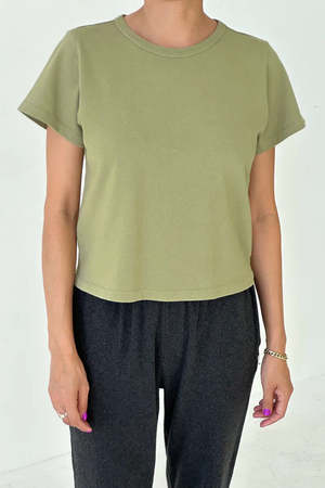 The Little Boy Tee in Mint Dust green uses a heavier-weight 100% cotton premium jersey blend to give it a snug yet flattering fit with just the right amount of stretch. Its suitable cropped length makes it easy to pair with any high-waisted bottoms. 100% cotton premium jersey. Garment washed and dyed for a beautiful natural worn-in look. Fabric and garments are made in Los Angeles. Model is 5'6", 110 lbs and wearing a size small. Measurements: - S: Length 20", chest 17.5" - M: Length 20.5", chest 18.5" - L: Length 21", chest 19.5" Made in Los Angeles, USA.
