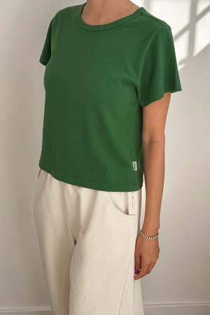 The Little Boy Tee by Le Bon Shoppe in avocado green uses a heavier-weight 100% cotton premium jersey blend to give it a snug yet flattering fit with just the right amount of stretch. Its suitable cropped length makes it easy to pair with any high-waisted bottoms. 100% cotton premium jersey. Garment washed and dyed for a beautiful natural worn-in look. Fabric and garments are made in Los Angeles. Model is 5'6", 110 lbs and wearing a size small. Measurements: - S: Length 20", chest 17.5" - M: Length 20.5", chest 18.5" - L: Length 21", chest 19.5" Made in Los Angeles, USA.