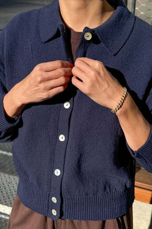 All the coziness of a knit with a light feel, the Club Cardigan is an effortless layering piece with a classic design. Made from breathable, lightweight cotton, it offers an airy quality similar to the Milo Sweater, but with a silhouette that features a gentle, fluid drape. A clean collar sits atop a functional front finished with authentic shell buttons, while an easy drop shoulder and tapered sleeves perfectly balance the slightly cropped length. - 100% Cotton - XS/S: Length 21", Chest 21 1/4" - M/L: Length 21 1/2", Chest 22 3/4"