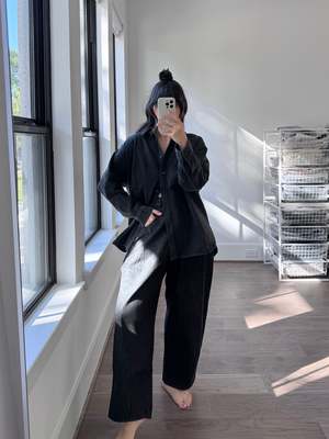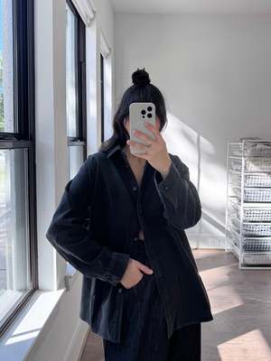 A timeless denim staple, perfect for layering or wearing on its own. Designed with the same relaxed fit as the Owen Shirt, but crafted in a slightly heavier, more durable denim fabric. Finished with an oversized silhouette, functional button front, contrast stitching, and a classic rounded hem. - Black denim - Loose fit - 100% Cotton heavy weight denim - Measurements: - XS/S: chest 25", length 29" - M/L: chest 26.5", length 30" - Machine wash cold with like colors - Model is 5'6" wearing Size XS/S - SKU #LBR5155 Please note, measurements are provided to serve as a guide. We are not able to guarantee each garment's measurements as there are slight deviations due to the handmade nature of our designer's garments.