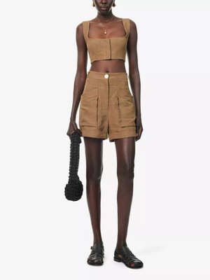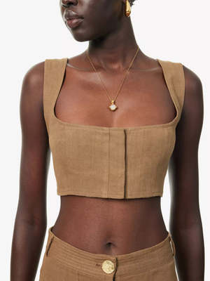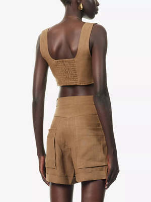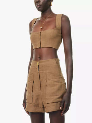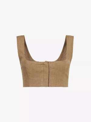 LE KASHA Jirja Linen Bralette Tobacco Made in high quality Italian linen that is naturally soft and resistant, the JIRJA crop top is flattering and easy to match. Designed with a low neck and front opening with crochet hooks, it has an elasticated back for comfort. Can be worn with matching HAIFA skirt as well as any high waist bottom. Composition: 100% Organic Knitted Linen Color: Tobacco Fit: True to Size