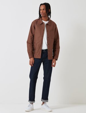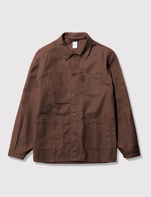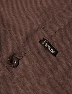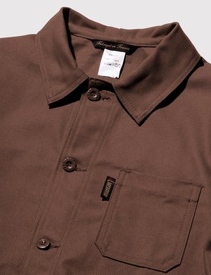 The Le Laboureur Cotton work jacket in Brown from the Le Laboureur work jackets core collectsion. The original French sack coat is made in France and has a classic, block fit. It features buttoned cuffs, chest pocket with woven label and two hem pockets. Product Details: Material: 100% Cotton Measurements: Pit-to-pit: XS: 18.5 inches S: 20 inches M: 22 inches L: 23 inches XL: 24.5 inches